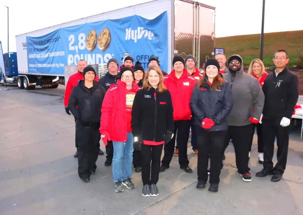 A team of 30 employees worked for five hours to assemble the sandwich, which consisted of 32 large cookies, each measuring 2 feet by 3 feet, and 182 cylinders of vanilla ice cream, each weighing 14 pounds. After certification by a Guinness World Records adjudicator, the ice cream sandwich was divided and donated to the Food Bank of Lincoln and the Food Bank for the Heartland, supporting local families in need.