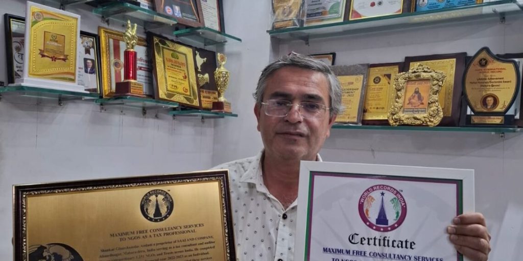 CA Shankar Ghanshamdas Andani, a dedicated social activist and philanthropist from Ahmednagar, has achieved an extraordinary milestone, earning recognition in the prestigious World Records India . His remarkable feat of managing the accounting, taxation, and auditing for 1251 trusts, NGOs, temples, charitable societies, and charitable trusts in a single year (2023) has set a new national record. This incredible accomplishment, done entirely free of cost, showcases his unwavering commitment to social service and excellence in his field.