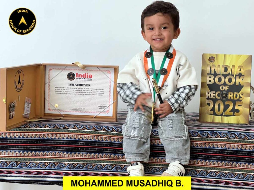 In a stunning display of memory and cognitive abilities, Mohammed Musadhiq B., a 2-year-old from Kasaragod, Kerala, has earned the prestigious title of ‘IBR Achiever.’ At just 2 years and 1 month, Musadhiq astounded experts by identifying and naming a wide variety of items, showcasing an extraordinary talent for memory recall.
