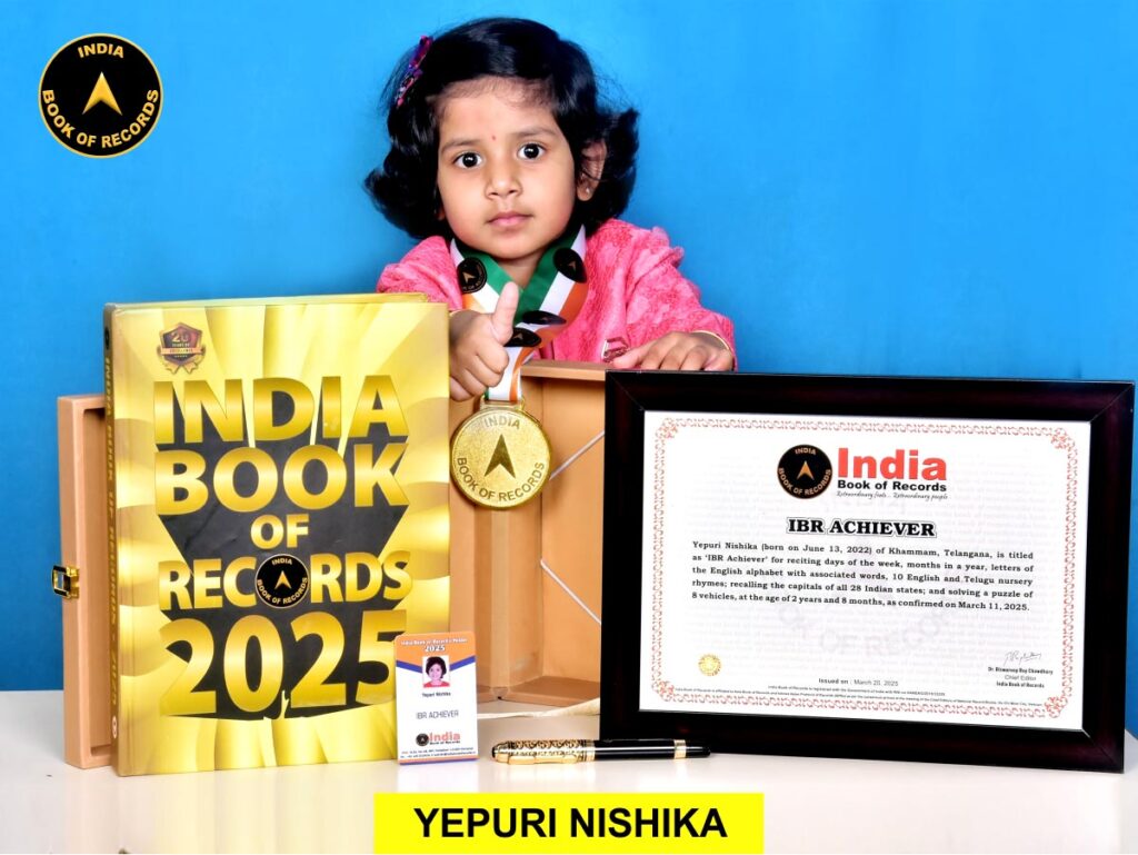 At just 2 years and 8 months old, Yepuri Nishika from Khammam, Telangana, has carved her name in the India Book of Records (IBR) as a shining example of early childhood brilliance. She has been officially titled an ‘IBR Achiever’ for her extraordinary ability to recite the days of the week, months of the year, letters of the English alphabet with associated words, 10 nursery rhymes in both English and Telugu, recall the capitals of all 28 Indian states, and solve a puzzle featuring 8 different vehicles — all before her third birthday.