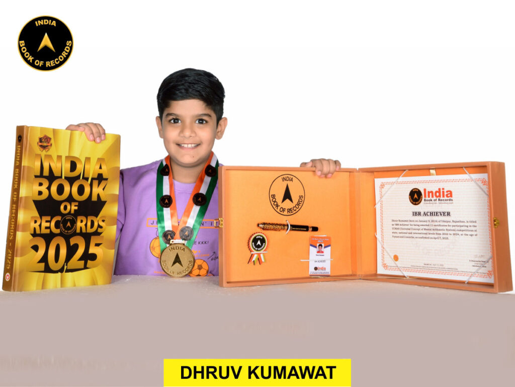 Dhruv Kumawat, a bright and determined 9-year-old from Udaipur, Rajasthan, has been officially recognized as an ‘IBR Achiever’ by the India Book of Records for an outstanding academic accomplishment in the field of mental arithmetic. At the young age of 9 years and 2 months, Dhruv was honored for receiving 11 prestigious certificates from the UCMAS (Universal Concept of Mental Arithmetic System) competitions held at state, national, and international levels between 2022 and 2024.