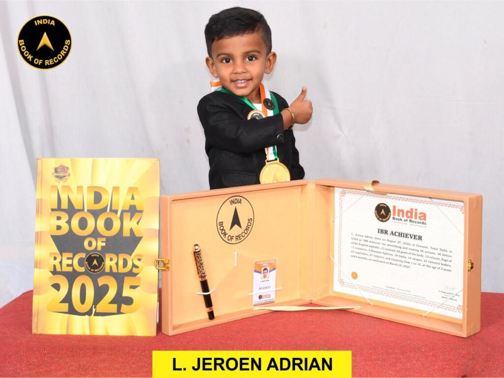 In a remarkable feat of memory and cognitive development, L. Jeroen Adrian, a 2-year-old from Chennai, has been officially recognized as an ‘IBR Achiever’ for his exceptional ability to identify and recall a wide range of categories. The young prodigy accomplished this extraordinary milestone at the age of 2 years and 6 months, as confirmed on March 10, 2025.