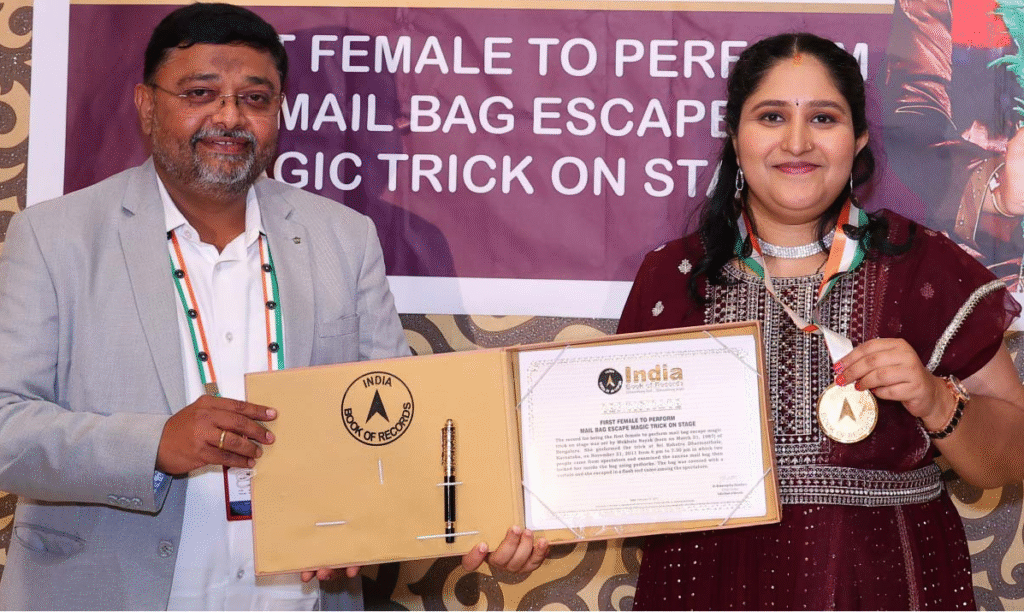 The record-setting performance took place at Sri Kshetra Dharmasthala from 6:00 PM to 7:30 PM, where a large audience witnessed the heart-pounding feat. In true Houdini style, two spectators were invited on stage to inspect and secure a canvas mail bag with padlocks. Once Mekhala was locked inside, the bag was concealed behind a curtain—and in a matter of moments, she miraculously escaped and reappeared among the crowd, leaving spectators stunned.