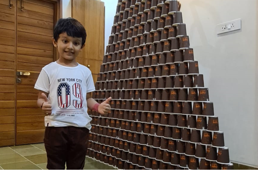 Mourya Milan Soni, a Senior L.KG student of Chanakya Academy in Bhuj, Gujarat, has set a remarkable new record at just 4 years old. Mourya constructed the tallest pyramid made from paper glasses, reaching an impressive height of 7.5 feet with 25 levels, using a total of 325 paper glasses.