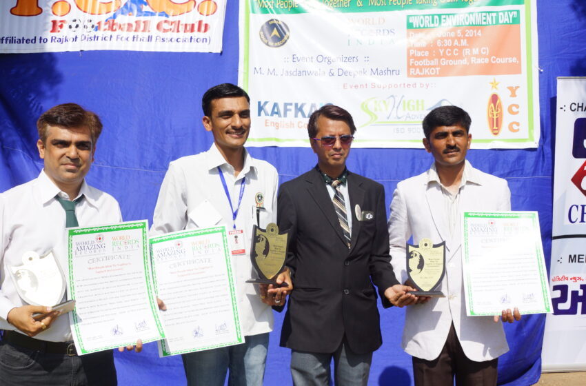 Dr. M. M. Jasdanwala, owner of Kafka’s English Corner, and Mr. Deepak Jagdishbhai Mashru, with support from the Skyhigh Adventure Club, organized a remarkable world record event to promote environmental awareness. A total of 263 participants from Rajkot city gathered at YCC Football Ground to take an oath simultaneously in English, Hindi, and Gujarati, pledging their commitment to protecting nature and the environment.