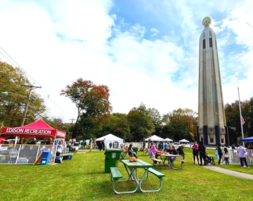 Rising above the historic site of Thomas Edison’s Menlo Park laboratory where he perfected the commercially practical incandescent bulb the sculpture measures approximately 13 feet 8 inches (4.17 m) tall and is crafted from heavy amber‑tinted Pyrex glass atop a roughly 131‑foot‑tall Art Deco tower.