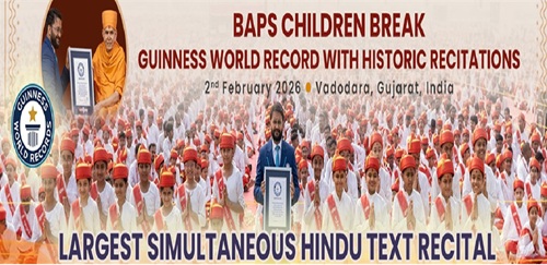 “In a remarkable display of devotion and discipline, children from BAPS Swaminarayan Sanstha have set a new Guinness World Records title through a historic mass recitation event held in Atladara, Vadodara.